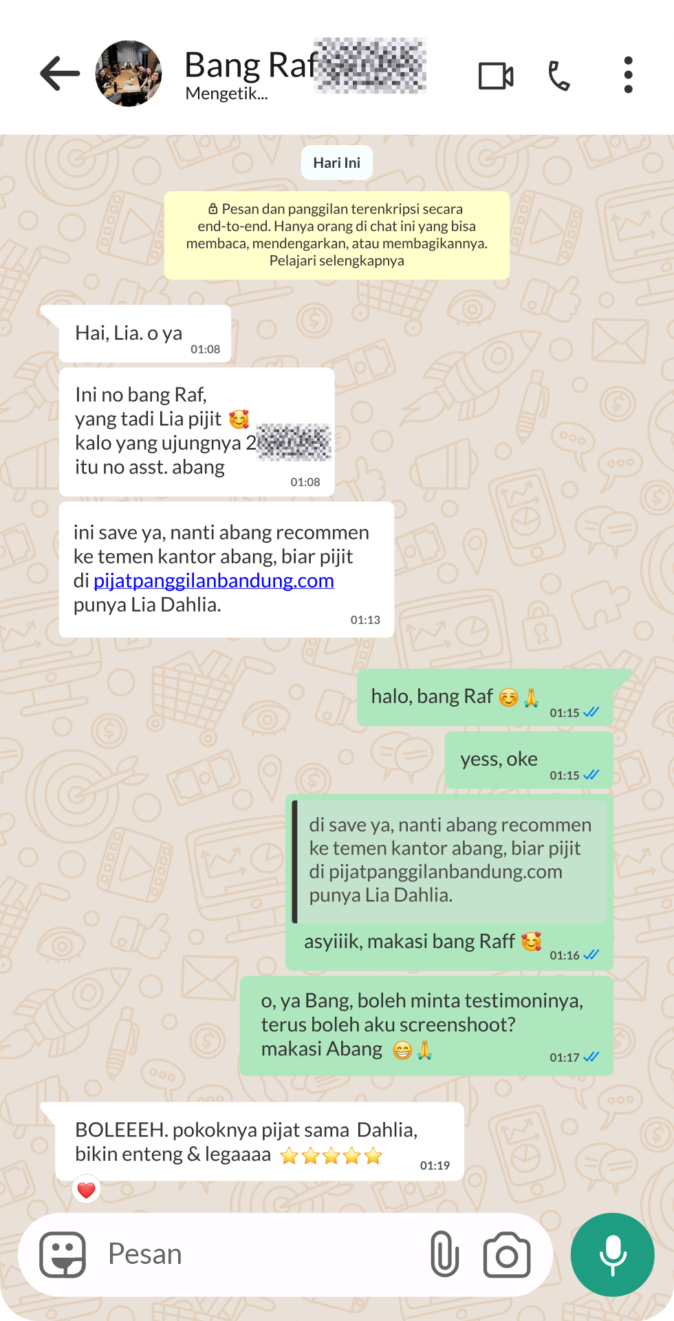 pijatpanggilanbandung.com salah satu layanan pijat favorit Pelanggan di Kota Bandung. Layanan Kami selalu dipilih dan digunakan kembali oleh banyak pelanggan untuk kebutuhan pijat sehari-hari. Kepercayaan ini tumbuh dari konsistensi Kami dalam memberikan pelayanan yang menenangkan, menyenangkan, dan menyegarkan.