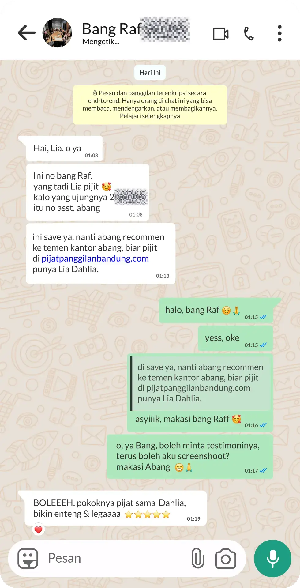 pijatpanggilanbandung.com salah satu layanan pijat favorit Pelanggan di Kota Bandung. Layanan Kami selalu dipilih dan digunakan kembali oleh banyak pelanggan untuk kebutuhan pijat sehari-hari. Kepercayaan ini tumbuh dari konsistensi Kami dalam memberikan pelayanan yang menenangkan, menyenangkan, dan menyegarkan.Β