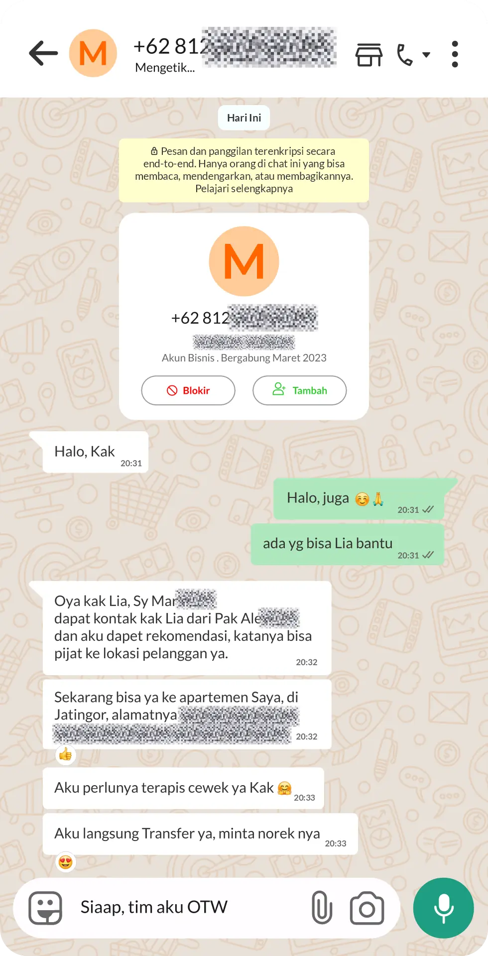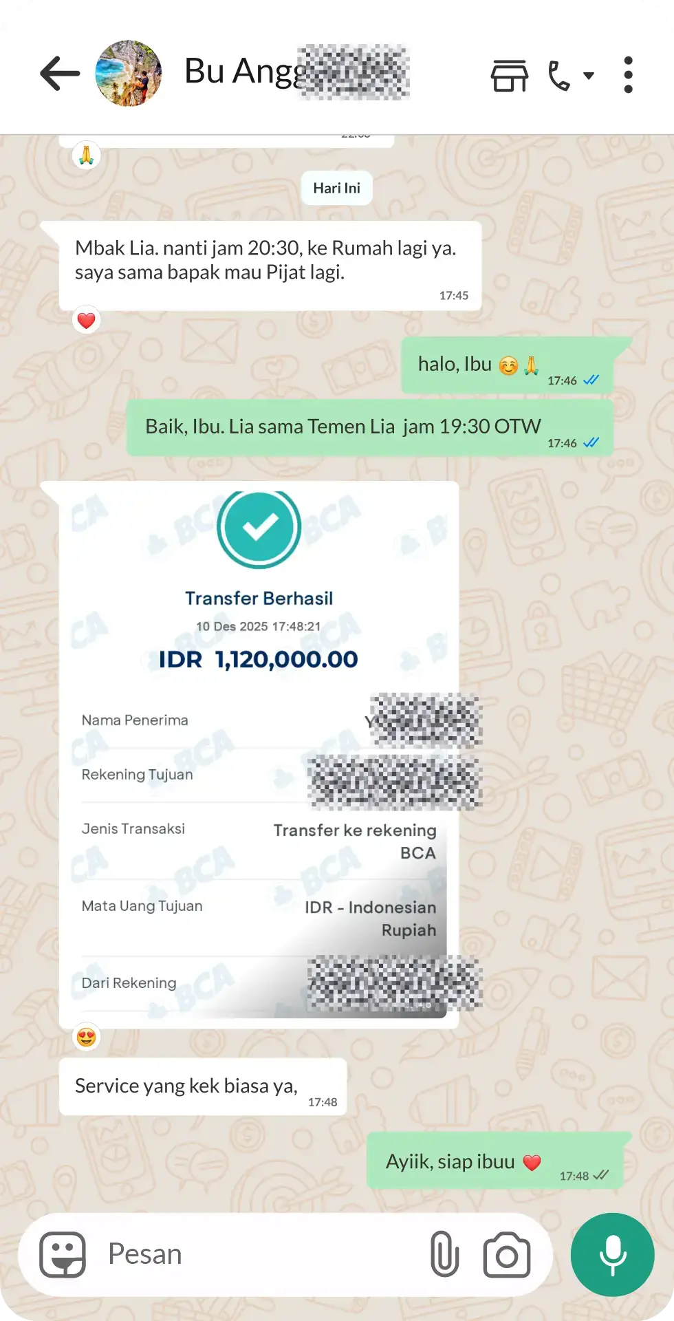 Invoice ini merupakan Invoice Booking Layanan dan digunakan sebagai bukti pemesanan. Biaya booking tidak termasuk biaya layanan pijat. Pelunasan layanan dilakukan langsung kepada terapis setelah layanan selesai. Mohon lampirkan invoice ini saat menghubungi admin WhatsApp.