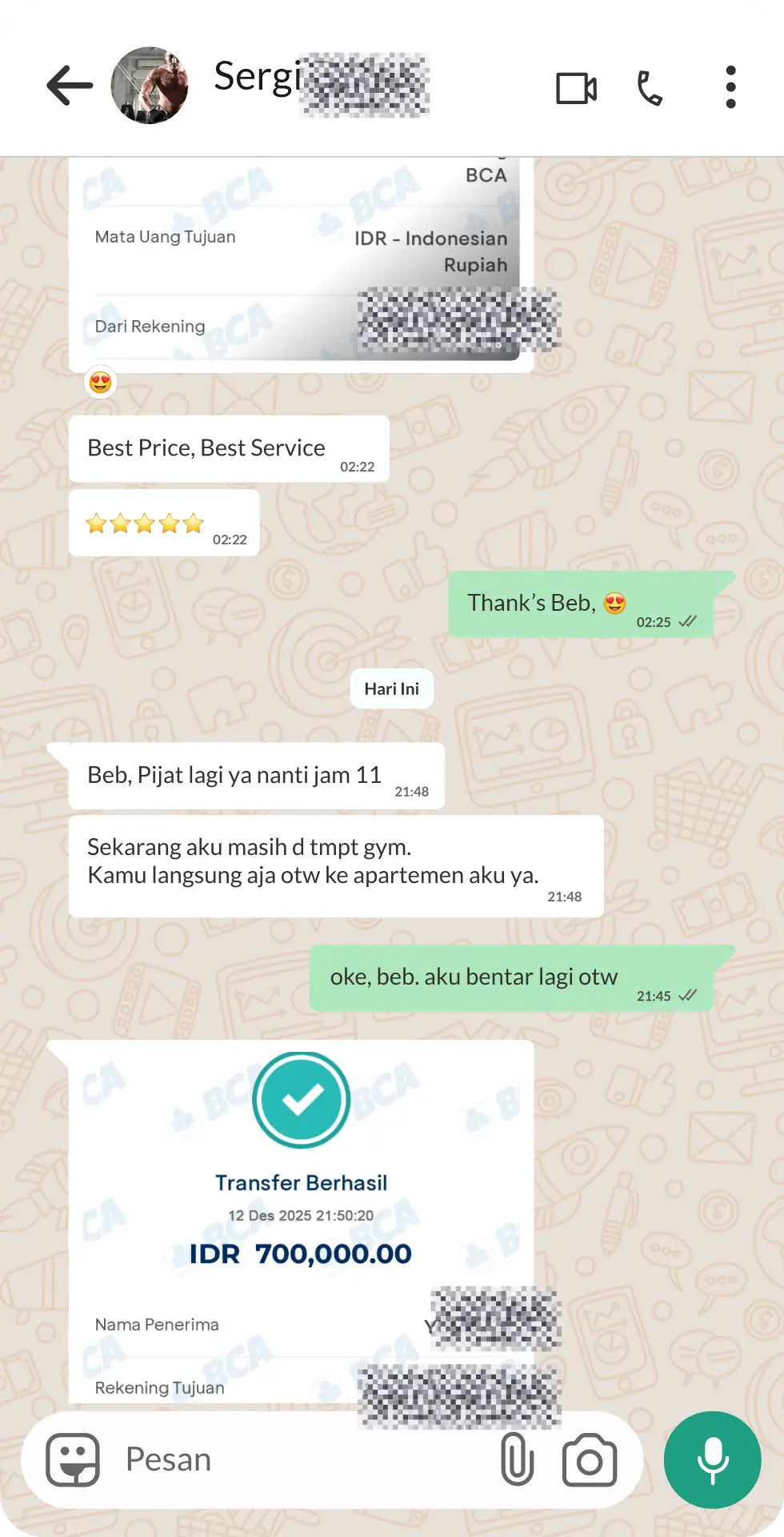 Setiap layanan dibuat untuk kebutuhan harian, dengan durasi yang fleksibel dan treatment pijat yang disesuaikan kondisi tubuh, sehingga pengalaman pijat terasa nyaman sejak awal, menyenangkan saat dijalani, dan melegakan setelah selesai.