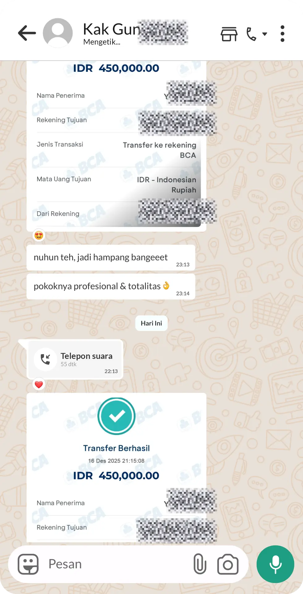 Tarif disampaikan sejak awal sesuai durasi dan layanan yang dipilih, tanpa biaya tersembunyi.